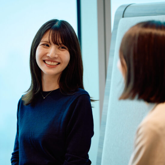 社内でのMTG。顧客提案に関する相談や、⾃⾝の成⻑について上司と会話する時間もあります。
