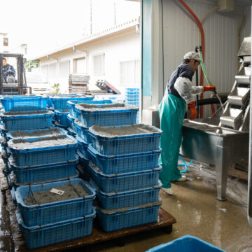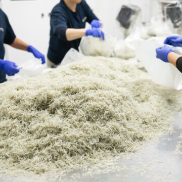 出勤・しらすの仕入れ確認 漁港で水揚げされたしらすの量や品質を確認します。新鮮な素材を扱うため、当日の水揚げ状況をチェックし、その日の加工量をチームで共有します。
