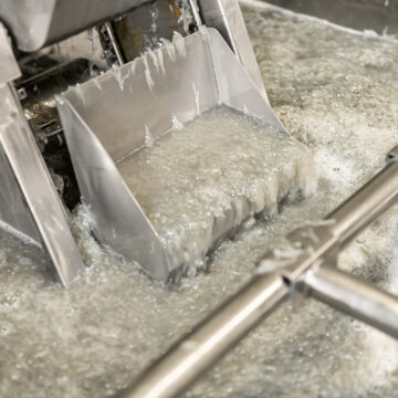 しらす加工スタート しらすを洗浄し、塩を加えて釜でゆでる作業を行います。その後乾燥機で乾かし、ふわふわの釜揚げしらすやちりめんに仕上げていきます。