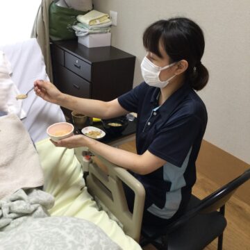 朝食介助・健康チェック 食事の配膳や介助を行い、服薬の確認も行います。食事の様子や体調の変化に気を配りながら、安全に食事ができるよう見守ります。