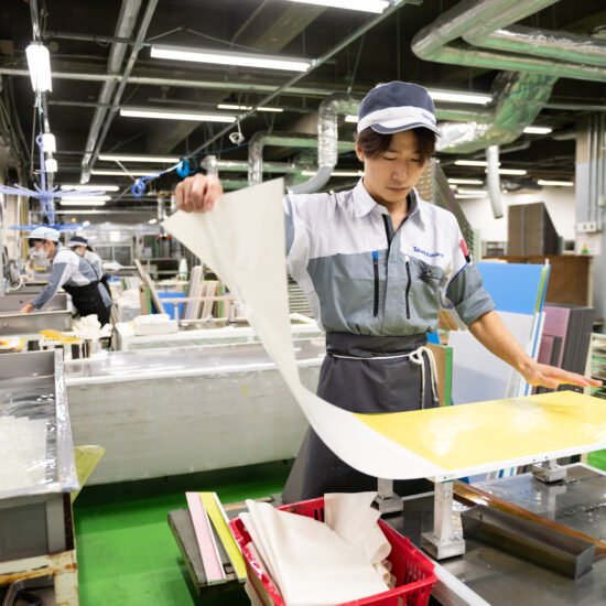 朝礼・作業準備 朝礼で当日の生産予定や安全確認を行います。名古屋工場ではホーロー製キッチンなど住宅設備の部材を製造しており、作業手順や役割をチームで確認してから仕事をスタートします。