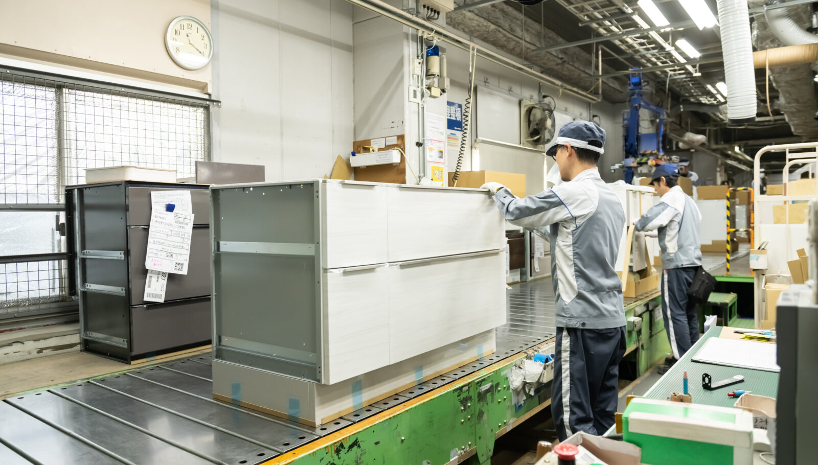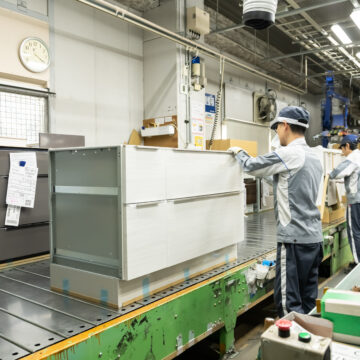 梱包・出荷準備 完成した製品を梱包し、全国の住宅現場や販売店へ出荷する準備を行います。キッチンや浴室など、人々の暮らしを支える設備がここから全国へ届けられます。