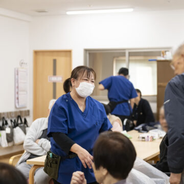 昼食介助・見守り 食事の配膳や介助を行い、安全に楽しく食事できるようサポート。嚥下や体調にも配慮しながら、一人ひとりに合った対応を行います。