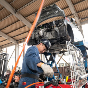車両の解体作業 入庫した車両から使える部品を取り外します。エンジン・ドア・電装部品などを丁寧に外し、再利用できる状態にします。